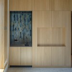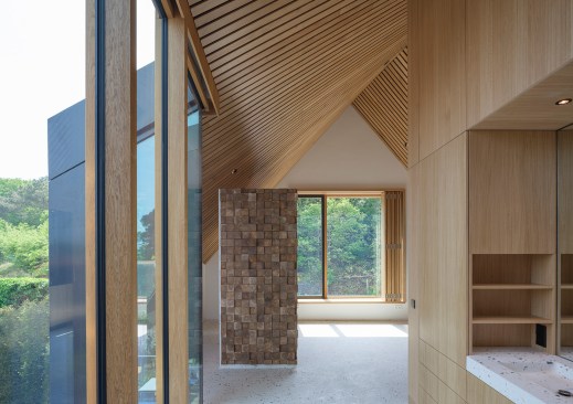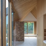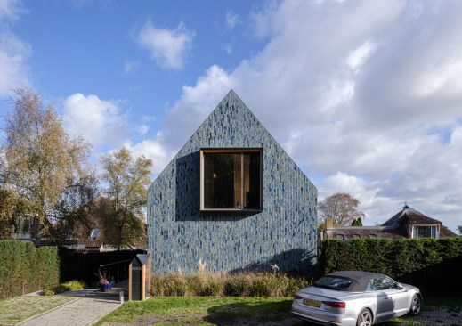 The strong connection between the landscape and the house translates into the expression of the facade and roof cladding with the application of a single natural material, expressed through a custom ceramic tile covering that wraps the entire building. This customised multicoloured glazed tile cladding represents the transitions in the landscape, from dune landscape to polder, and the soil layers, from light to dark.In the interior, all living spaces are organised around the curtain wall-enclosed voids and an enclosed wood-cladded core. The curtain wall provides transparency and daylight down to the basement levels. The enclosed element-feature of the interior from the basement to the hood of the building accommodates supporting functions. The interior design is completed by beautifully framed views of the surrounding countryside, utilising wooden frames passing through the traditional tile work.