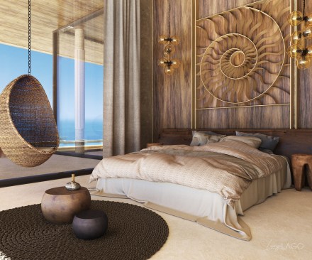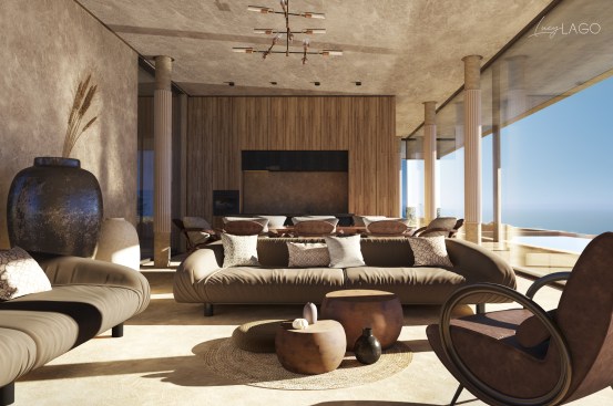 Materials of facades has warm colors. The use of wood, cream vanilla marble and local stone makes the villa part of the landscape. It creates harmonic dialogue between nature and architecture.An infinity pool connects the sea to edge of the pool. This water environment makes you feel as if you are one with the horizon, floating above the landscape, luxuriating in sky, and finally understanding how it feels to be a bird.
