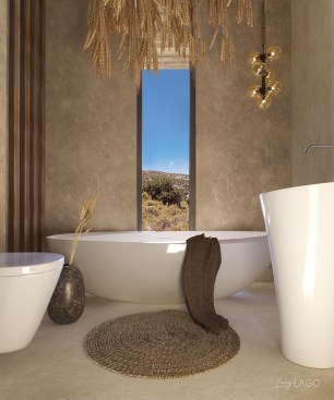 Area of the villa is 200 m2. Villa Domy consists by open kitchen, living and dining area, 3 large bedrooms, 3 bathrooms and wc. It has panoramic views to the sea, Marathonisi and Peluzo islands. The villa harmoniously fits into the landscape of the environment, creating a single ensemble with nature.