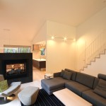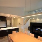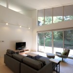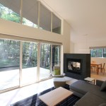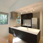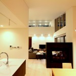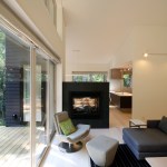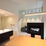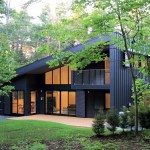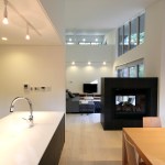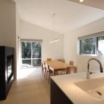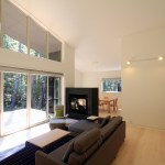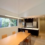 The living room with a large window that can overlook the larch forest in front of the square plan plan has a spacious ceiling height of about 5 meters, and the dining room is surrounded by a fireplace with a glass opening on two sides. It is connected with the kitchen. The 3 bedrooms are on the north side of the building across the corridor behind the living room. A powder bathroom is located on the south side.