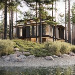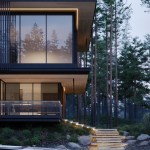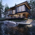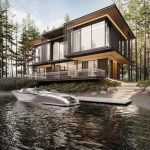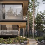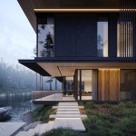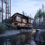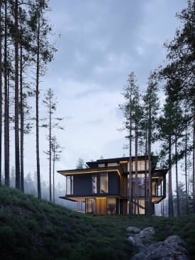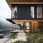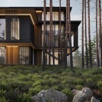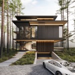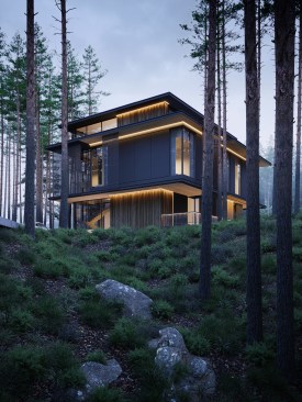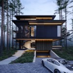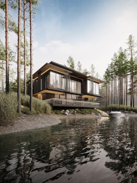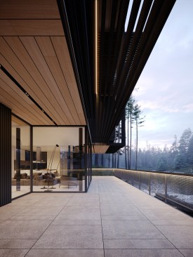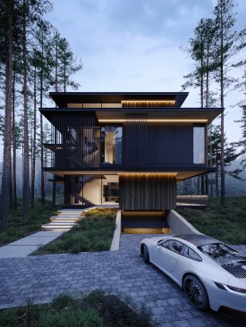 Three elements should be embodied in the architecture of the house: nature (forest), water, and the city. The used materials, such as wood and architectural concrete, correlate with the natural and urban context. The visible architectonics of the villa is expressed in the rhythmic alternation of transparent and impenetrable, dark and light, verticals and horizontals, the ratio of volumes and heights. The villa looks harmonious, holistic, and light.