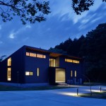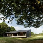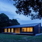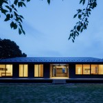 23 m × 10 m single-stream volume was placed at the center of the site to open on a long site north to south and a large site adjacent to the west. On the east side of the building is a tree-lined road leading from the entrance of the site to the entrance of the building. On the west side is a lawn open space that leads to the adjacent forest.