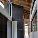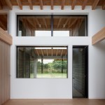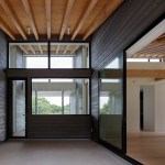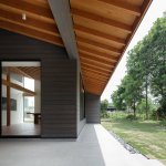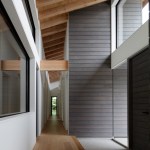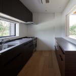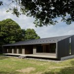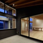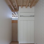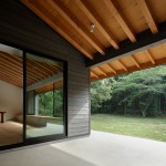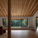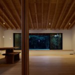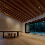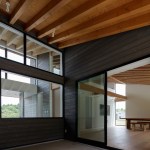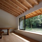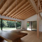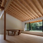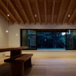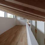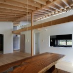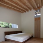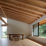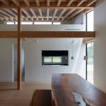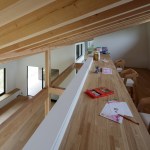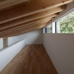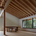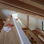 The distinctive single-flow roof is 23 meters long, with the same structure as the shed structure representing an impressive interior. In the attic area, there are two spaces for children going up and down with ladders in the north and south. The attic space on the north side is a bedroom for a large number of guests. The attic space on the south side overlooking living dining is used as a library for children and a space for study.