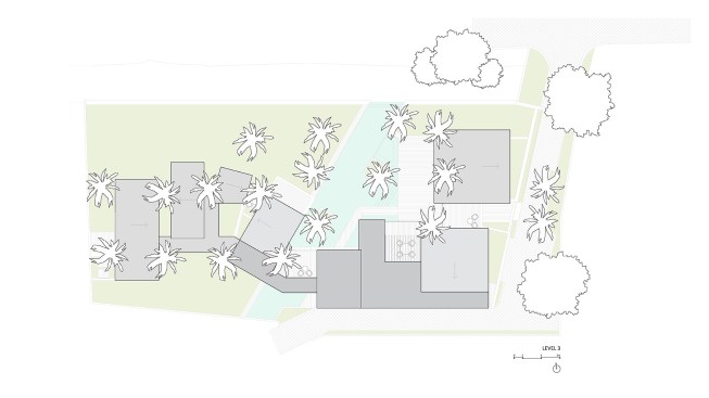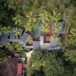 Roofs pitched at different angles pay homage to the monsoons and accentuate the staccato nature and fragmented aesthetic of the building. The interstitial roofs which cap each unit individually harvest rainwater, while further visually integrating the building in the lush landscape.