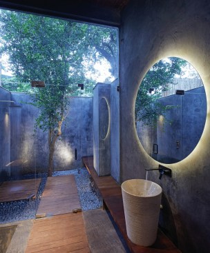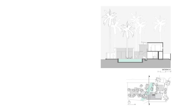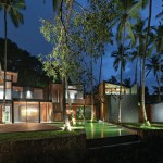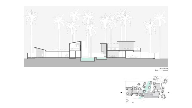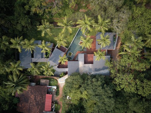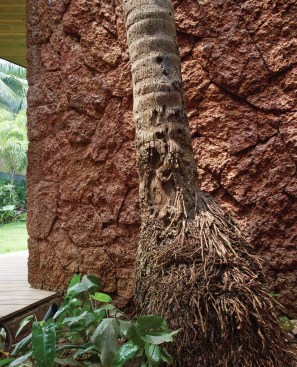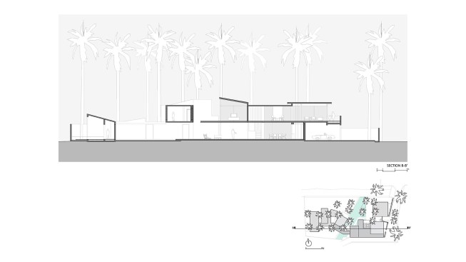 Embedded into the natural landscape, Villa in the Palms appears almost village-like, pockets of small homes nestled between 80-year-old coconut trees, nearly invisible from points further up the approach road. The fact that the trees on site existed for decades gives the overall house a very rooted presence.