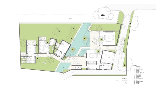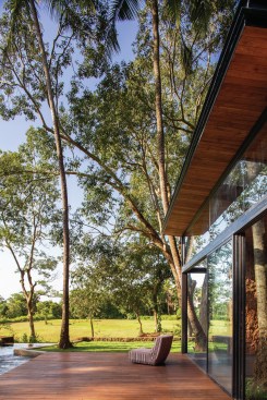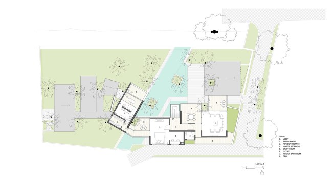 Villa in the Palms is named after the 19 towering coconut palms that thrived for decades on the land, which dictated the villa's concept and footprint. This four-bedroom house overlooks a field and a seasonal stream.
