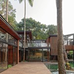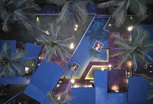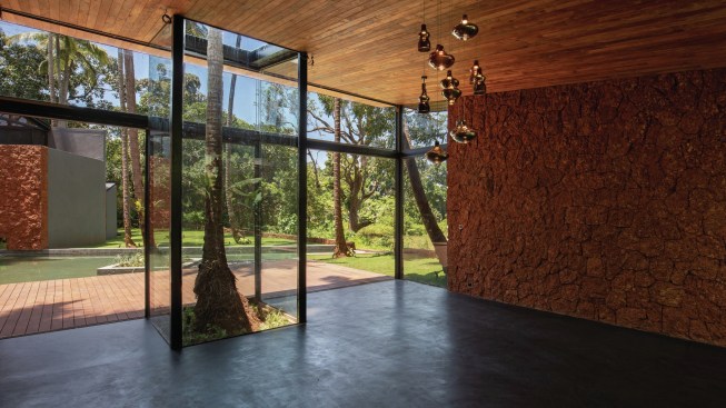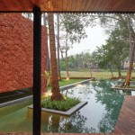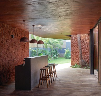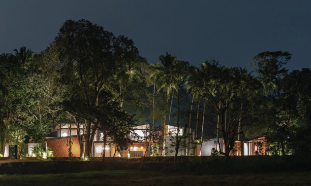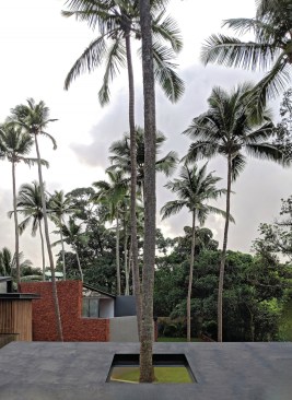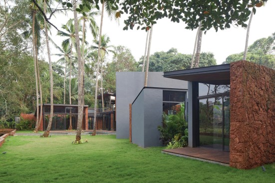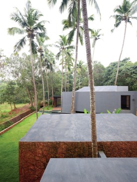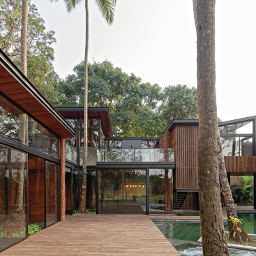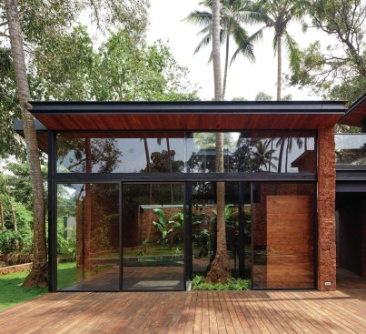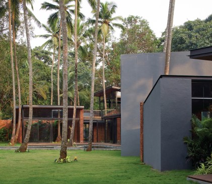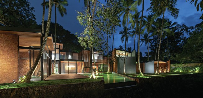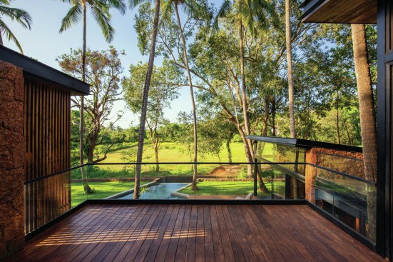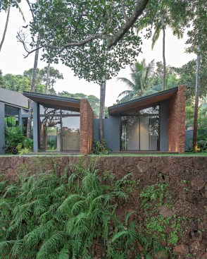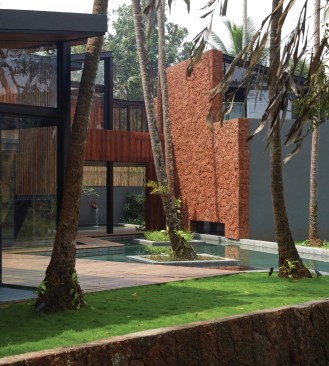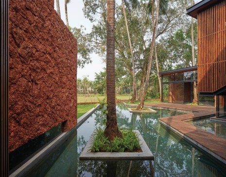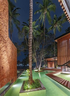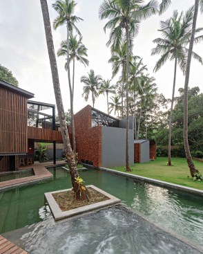Consequently, the structure is fragmented rather than monolithic, reminiscent of an old-time Goan village but at the same time entirely modern. Each bedroom on the ground floor, for example, feels like a separate home, replete with an en-suite bathrooms, a rear garden, a front garden and an internal courtyard flanked by laterite walls. These independent volumes are interconnected with decks, passages and bridges that meander through the trees and over pools and gardens.