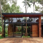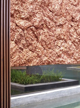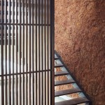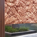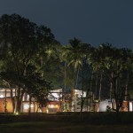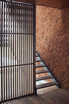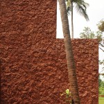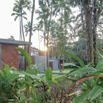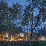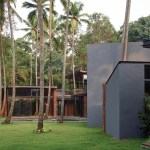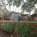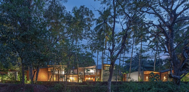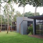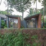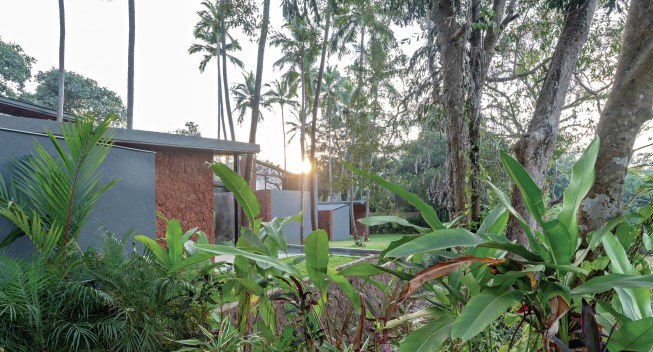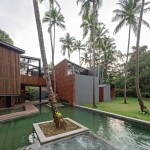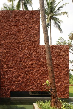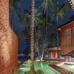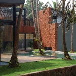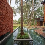 The building design adopts distinct local features and materials of the tropical coastal state of Goa, with exposed local laterite stone walls, sloping roofs and screens made from 100-year-old recycled teak wood, while the landscape design consists of local tropical species (mostly various types of palms) that maintain their lush greenery through the year.