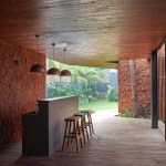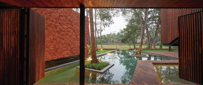The main entrance features a kind of dramatic crescendo, with a view that widens with each footstep – first some exposed laterite stone, then a glimpse of the pool, then the gardens and finally the wide field beyond. At one side is a sky-lit living room with internal garden and walls of exposed masonry. At the other side is an open kitchen and dining room featuring a wet bar, all overlooking an expansive deck and pool (three distinct water bodies are separated by teak-wood bridges and tree islands).