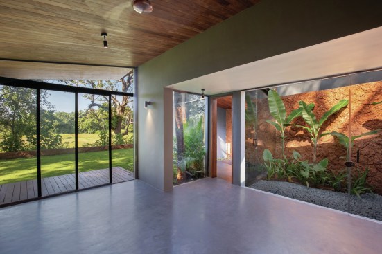 While everything is open and filled with light and air, the house is still very private. The laterite walls thermally and visually shield each room, maintaining privacy while orienting for the best views of the northern field.