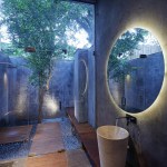 A bedroom abuts the pool, with a slit window along the floor that enables the ripples of water to reflect onto the ceiling. All the lower floor bathrooms have in-built sunken bath tubs to enjoy the adjoining courtyard landscapes. The last bedroom features a serene indoor-outdoor bathroom where light and shadow create everchanging landscapes