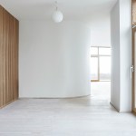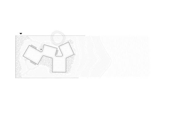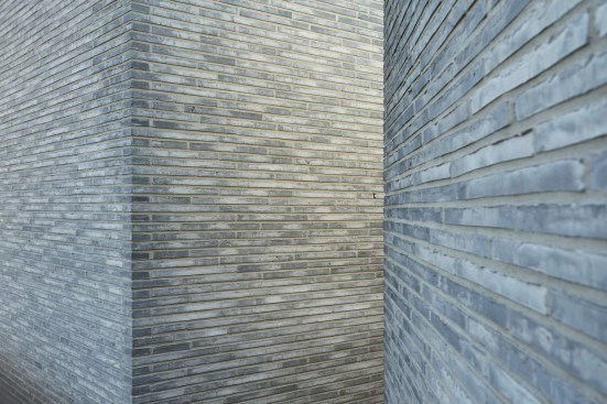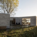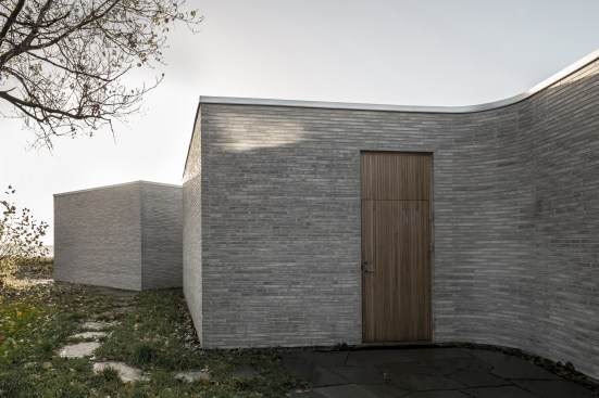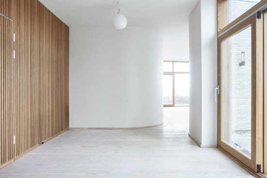 Sand colored Kolumba brick and robust oak framing, add solidity to the villa, humbly adapting it to the exposed site. Curved white walls and broad plank floors melt the interior spaces together. All primary spaces have a contrasting end wall with a piece of handmade build-in furniture: a bookcase spanning an entire wall of the living room, a customized kitchen, a lamellae wall in the entrance room providing access to the basement and a wardrobe, and finally a full cabinet wall in the master bedroom with access to the bathroom. The basement has three guest rooms and a TV-room, all lit by natural daylight from light wells. Oak benches along the facade cover the light wells.