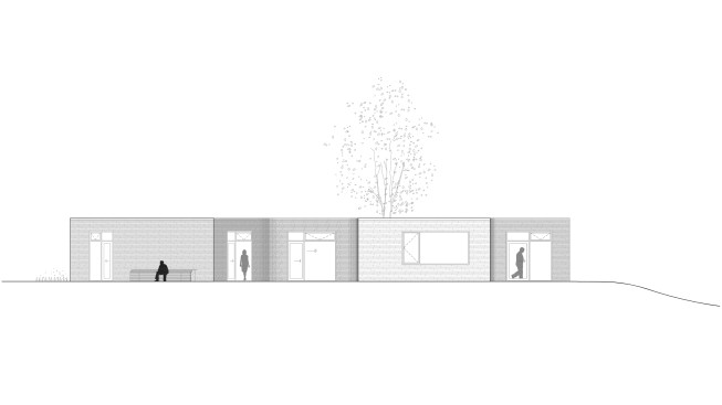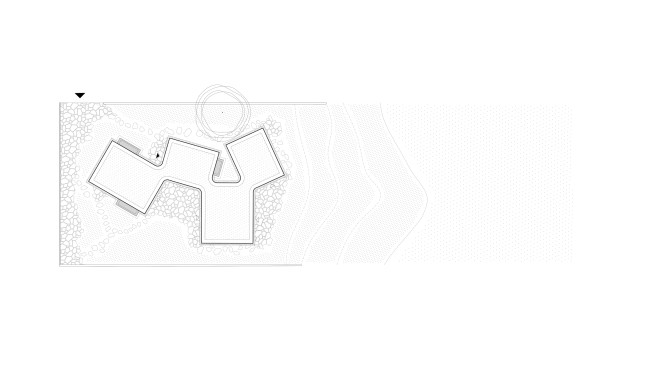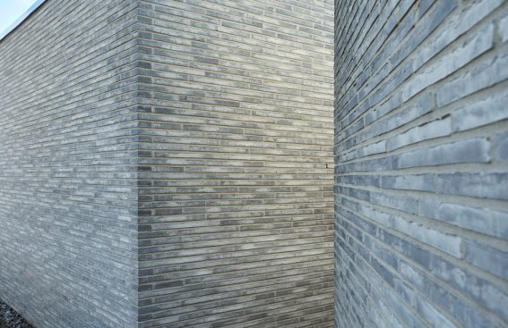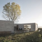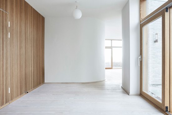 Sand colored Kolumba brick and robust oak framing, add solidity to the villa, humbly adapting it to the exposed site. Curved white walls and broad plank floors melt the interior spaces together. All primary spaces have a contrasting end wall with a piece of handmade build-in furniture: a bookcase spanning an entire wall of the living room, a customized kitchen, a lamellae wall in the entrance room providing access to the basement and a wardrobe, and finally a full cabinet wall in the master bedroom with access to the bathroom. The basement has three guest rooms and a TV-room, all lit by natural daylight from light wells. Oak benches along the facade cover the light wells.