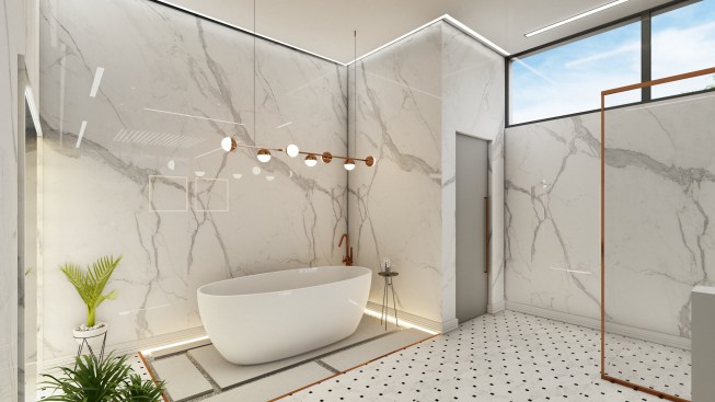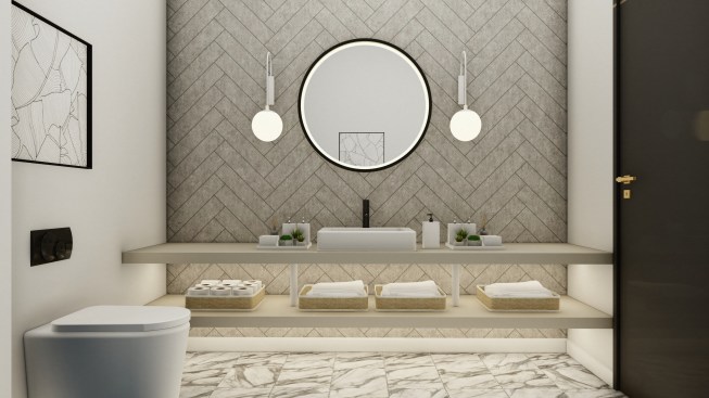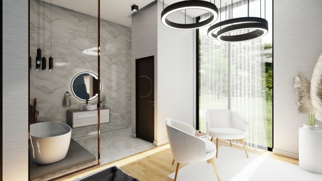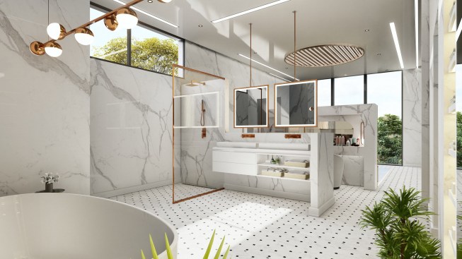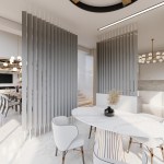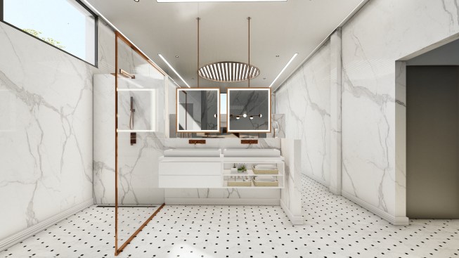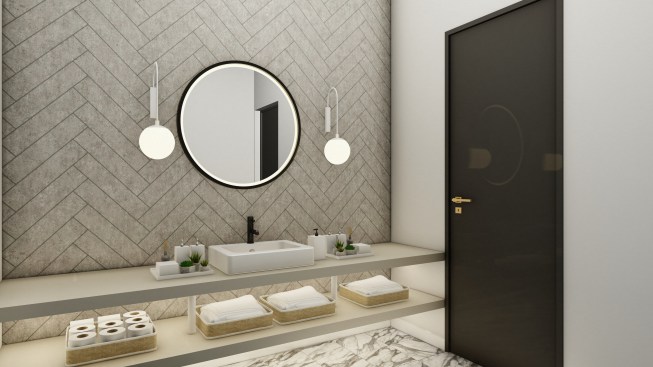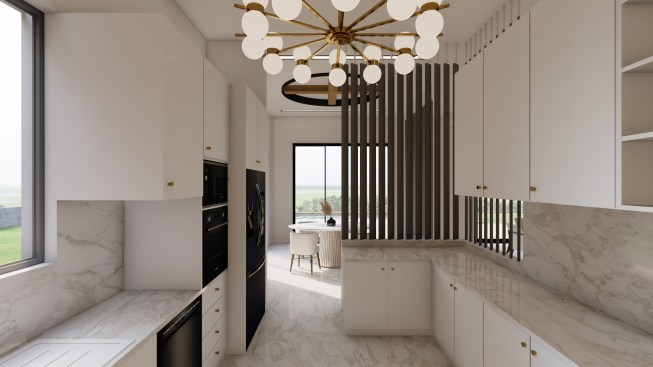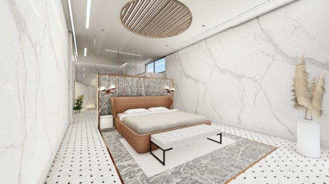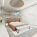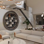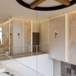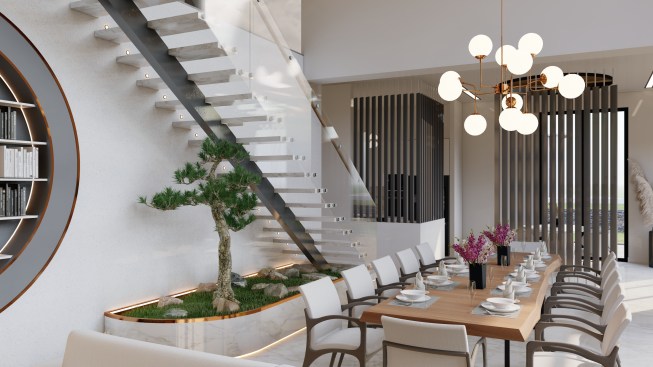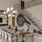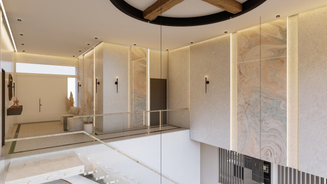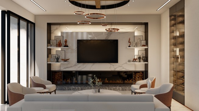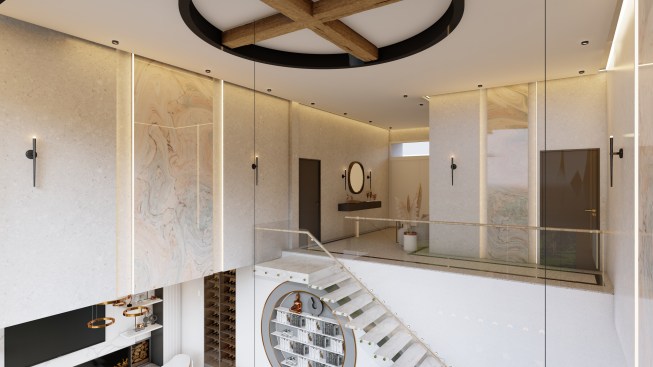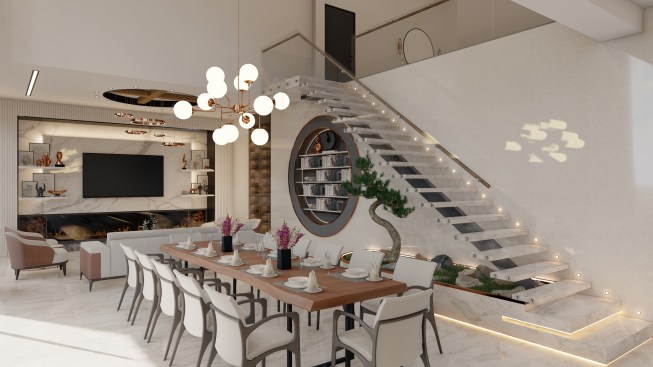 In the living room design, a circular shelf is designed under the stairs leading down to the 2-storey gallery. This circular approach continues in design ceiling designs. The hall consists of 3 zones: living area, dining area and breakfast area which is connected to kitchen. The breakfast area designed in front of the kitchen is semi-openly separated from the main dining table in the 2-floor-high volume with vertical elements. The area under the stairs was designed with a Japanese miniature bonsai tree to create a green texture in the space and a small function was added to this unused area. The TV area provides a warm seating area with the shelves around it and the fireplace area underneath. The master bedroom is accessed from the dressing room. Servants responsible for washing and putting the clothes back in their place cannot enter the master bedroom directly. In the master bedroom, a make-up area has been designed between the bathroom and the bedroom. Bathroom, make-up area and bedroom are designed as a single space. The vanity wall, which does not reach the ceiling, separates the bed and the make-up area. Bathroom mirrors are designed by hanging from the ceiling instead of being mounted on the wall. The mirrors are designed as led lit mirrors, so there is no need to put an extra sconce. In the bathroom, two separate areas are designed as a bathtub and a walk in shower. The hall area on the ground floor is handled as a pantry area for the kitchen with the cabinets designed on the wall. Spa and gym hall are designed on the basement floor.