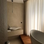 Consistently placed openings perforate delicate sculptural form, and so a play of lights and shadow is created. The main lighting of each functional unit is insured by big glass surfaces oriented to the views. Secondary parts of the villa are illuminated through ribbed windows and support their shape. The form of the villa stands out and is perceived as a whole. The fundamental premises of the design are emotions and comfort, which are reflected in the interconnections of the elements and clean details. Comfort starts with a spacious entrance with comfortable seating, its background offers visitors a view of the dominant of the city – Bratislava castle. Interior doesn’t owe anything to the impression of the exterior. The space is completed by custom-made furniture integrated into the very form and so becomes its component. It supports the flow of the space and strengthens its naturalism. Last but not least, it was important to ensure fitting lighting, which brings a luminous experience to the villa even after dark.