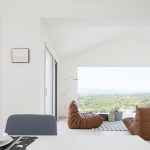A wide fixed frame in the living room and a large opening in the last patio extend the house on the landscape.
