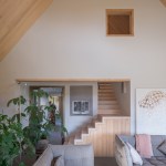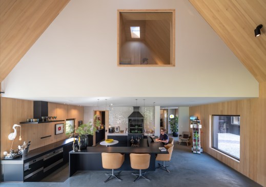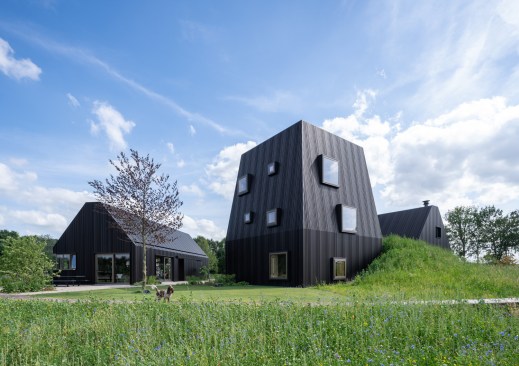 The two lower volumes are shaped like typical gabled barns directly connected to the surrounding gardens. The higher volume captures the view of the wide landscape and forms a striking contrast with the lower buildings. The tallest element, the most prominent building, contains the master bedroom on the ground floor, children’s rooms on the upper floors and a roof terrace at the top. Of the two barns, one is furnished as a living room, kitchen with dining area and a large veranda on the south-west side, with a workspace and playroom on the first floor.