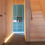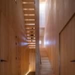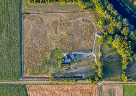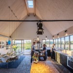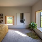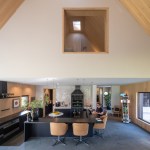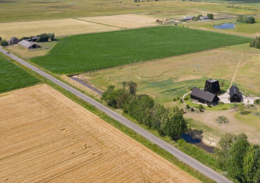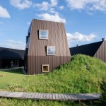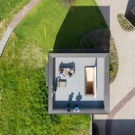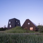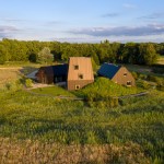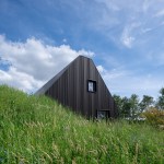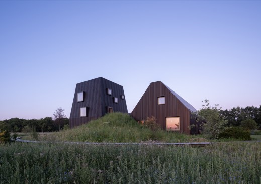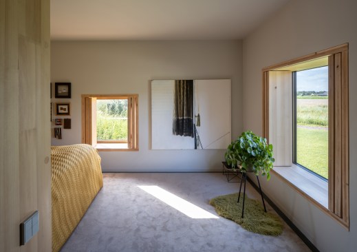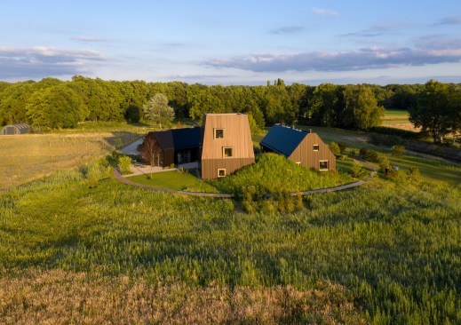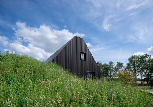 The other barn features a cooking studio where up to twenty people can participate in culinary classes, workshops and team-building activities led by the client. Next to the studio is a garage, storage area and a guest suite on the first floor. Large sliding doors in the centre can be opened to reveal an entrance gate to the courtyard.The design ambition endeavoured to connect the residential functions while maintaining the detached traditional farmstead typology. To this end, a half-sunken corridor, concealed beneath a grass mound, links the taller landmark volume with the barn’s living room. The barn containing the cooking studio and guesthouse, is completely detached, maintaining sightlines from the courtyard to the surrounding landscape.