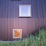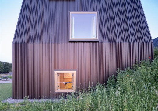 The Villa’s construction and detailing also emulate the Dutch ‘hoeve’ or farmstead. The exterior dark bronze anodised aluminium cladding, chosen to seamlessly extend beyond the façade to the roof top, is profiled to resemble the corrugated iron roofs of nearby farm buildings. The window frames, which traditionally have a brighter colour, have a lighter bronze aluminium finish.