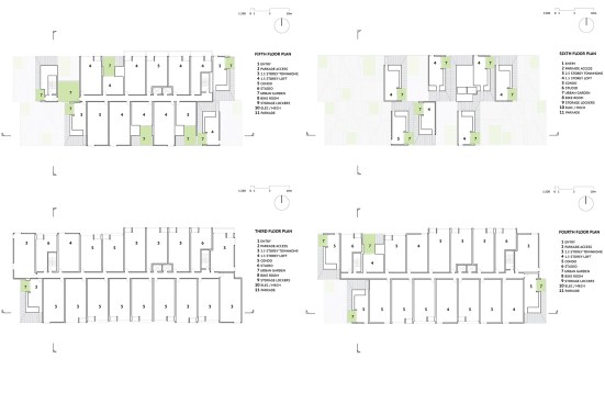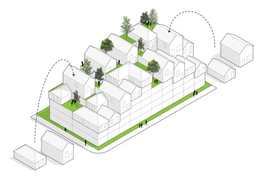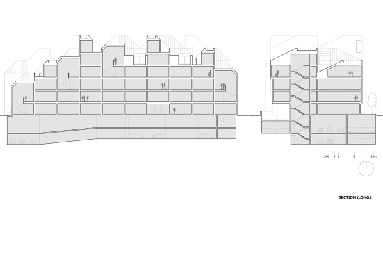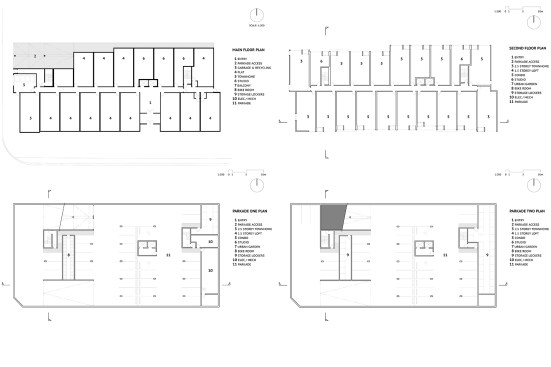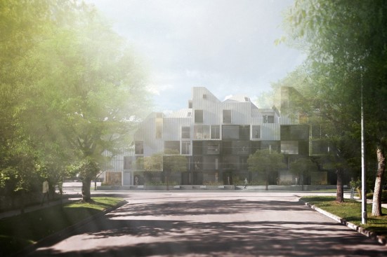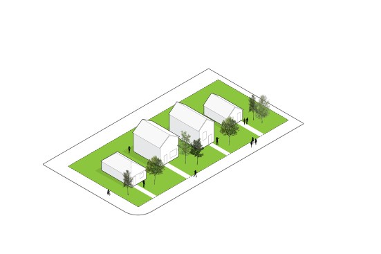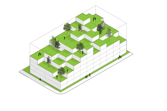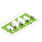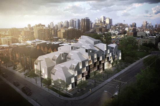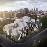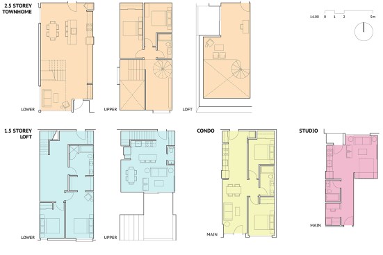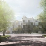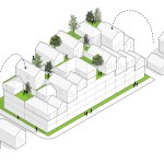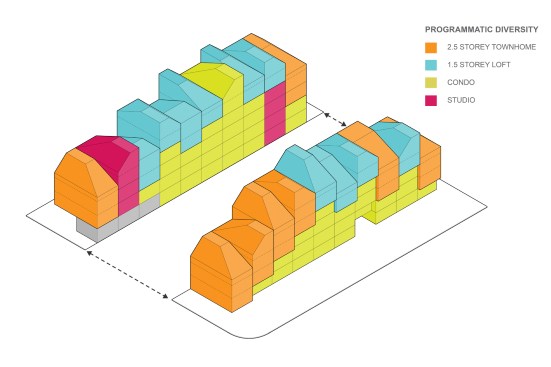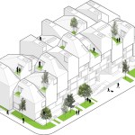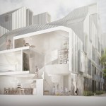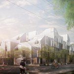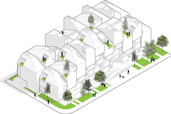 Situated in Calgary’s Bankview neighborhood, southwest of downtown, Village is in some ways a typical urban housing development, with 78 units ranging in size from 475-square-foot studios to 1,100-square-foot townhomes. The difference, though, is that where most designers would put the townhomes on the first few floors, local firm Modern Office of Design + Architecture (MoDA) inverted that order, placing the studios and smaller units on the lower floors, and the two- and three-bedroom townhomes on top. The result of what MoDA calls “modulating density,” an arrangement that puts more people closer to the ground and the surrounding neighborhood, at more affordable prices, while providing additional privacy and oversized patios for the townhome residents above. This is a particularly attractive feature in a city where many suburban residents are still not used to the idea of multistory, multifamily living. The patios are arranged to flow from one to the next, replicating, on a smaller scale, the suburban backyard. At the same time, the smaller units at street level reduce the scale of the building, which sits at a busy intersection; the exteriors of the studios are black and the townhomes white, so that passersby can “read” the order of the units. Village also has just 58 parking spots, lowering the unit price-point and encouraging many residents to go without a car, either by walking or using public transportation. The 62,000-square-foot project, which is still in its conceptual stages, will include about 30 different residential layouts.
