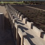 A 19 ft deep basement was done to avoid the use of refrigeration and humidity control systems, taking advantage of geothermal excavation and economizing the energy use. With the earth obtained from excavation of the basement thousands of earth block were produced to build a grid of columns in 16 x 16 ft organized according to the trace of the lines of the vines.