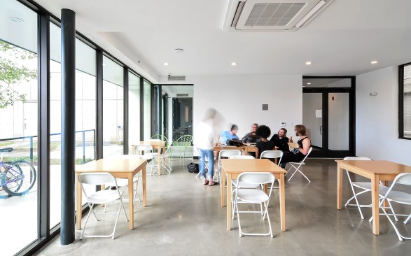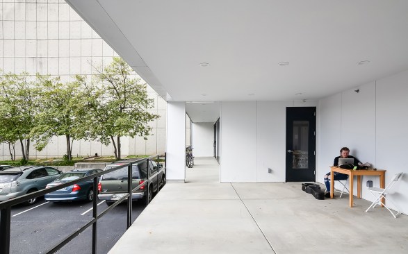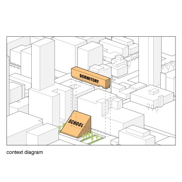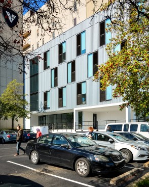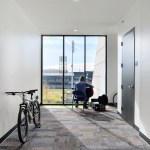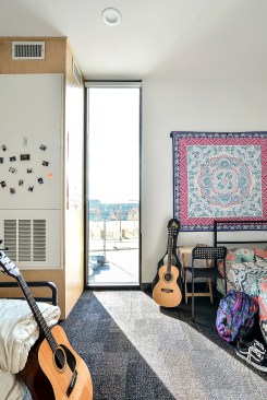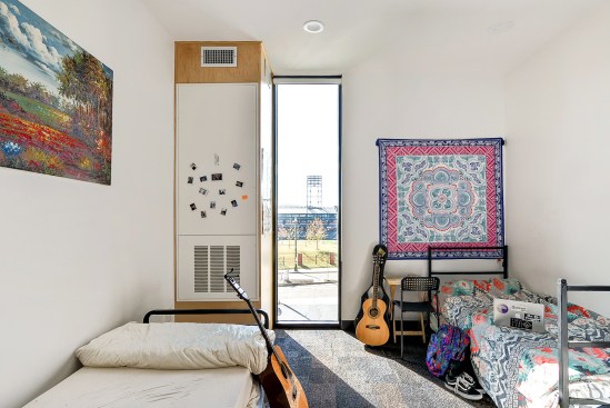 Each Student Studio has high ceilings to create a feeling of spaciousness, a Juliette balcony with an oversized operable window that engages the city, dual closets, a kitchen with full height cabinets and fold-out counter, a full bath with shower, and storage space above the core of 60 square feet. The unit is three-fourths the size of a two-car garage, yet it feels substantially roomier than traditional dormitory rooms. Modern design affirms that you don’t need much space if it is designed well.