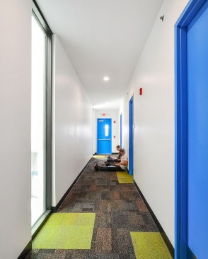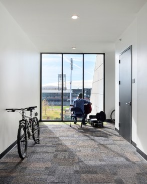 Each unit is divided into ‘Life’ and ‘Care’ elements. The Life element supports living, studying, sleeping and eating. The Care element supports cleaning and storage. The perception of space within the Student Studios is substantially larger than the construction square footage and provides opportunities for two students to enjoy both private and shared space.
