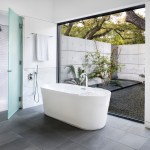 The master bedroom is enclosed on three sides, emphasizing the view outward, while the low-slung roof and deep eaves create a sense of horizontality. The bed, nightstands, and light shelf are made from white oak to match the floors; all were designed by the architects. The theme of bringing the outdoors in continues in the master bathroom, which opens up to a private garden encircled by concrete walls beneath a canopy of oak trees; even the shower has direct access to the exterior.