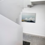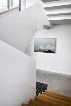 The staircase is part of a procession that starts with a low-slung facade facing the street. A series of massive concrete walls extends out into the landscape, creating a series of outdoor spaces and drawing visitors in. Floor-to-ceiling windows provide a glimpse of the central staircase and the views beyond, while the metal roof sweeps upward in a low, graceful arc. The exterior motifs of this front elevation are indicative of the home’s overall design. Exposed concrete, metal, and concrete panel cladding—chosen for their ease of maintenance—are the predominant materials. The distinct sloped roof profiles provide directionality, essentially “pointing” to the views beyond. The innovative cladding system of concrete panels doubles as a rainscreen, protecting the structure from the elements and providing increased thermal efficiency.