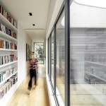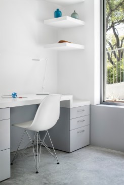 From the foyer, a bridge-like corridor lined with bookshelves and art leads to the master suite. The hall opens up to a two-story, open-air courtyard, which separates the private master suite from the main living areas while bringing natural light and views into the core of the house.