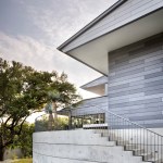 Tucked into a steep site in West Austin, the Vista Residence is organized around a three-story, sculptural steel staircase that acts as the hinge point for the residence, with rooms and hallways unfolding from it on every floor.