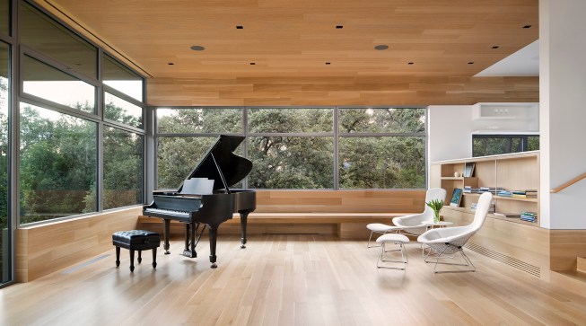 In addition to large parties, the living room also plays host to music recitals. Acoustic wood ceiling panels enhance the sound quality and provide visual warmth. Built-in benches and steps allow guests to find a comfortable corner.