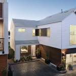 The homes are arranged with varied massing, with two-story homes placed at the front of the site to be more in line with the existing neighborhood. Clean lines and simple forms define the modern flair of these homes, with warm, contemporary colors, stucco exteriors, traditional lapped siding, and oversized windows that create sophisticated exteriors, enhance natural light, and provide a seamless flow between the indoors and outdoors.