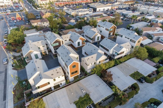 The firm packed 20 detached, single-family homes into two adjacent infill sites measuring just half an acre each, without sacrificing design quality. The homes, some of which are only 6 feet apart, tap into Costa Mesa’s small lot ordinance that eases zoning standards for developments of 15 or fewer detached homes in certain areas.