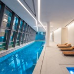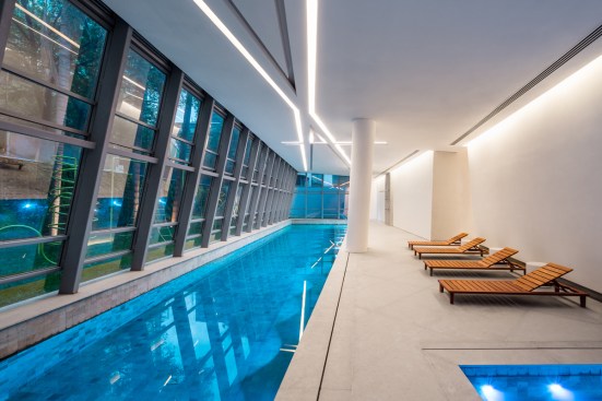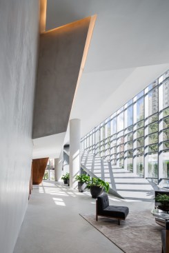 Vitra features fourteen floor-through residences and a penthouse, each featuring a unique floor plan ranging in size from 6,080 to 12,325 square feet. The sun-soaked lobby features a cast-in-place concrete reception desk that is set against a floor-to-ceiling Brazilan wood wall. The pairing of concrete and warm wood is echoed throughout the building’s clean, modern interiors. Interior designer Dado Castello Branco outfitted the interiors with artworks such as “Ultramar Intervalo” by famed Rio de Janeiro artist José Bechara. The building’s amenities include a swimming pool, spa, gym, multipurpose lounge and a playroom for children.