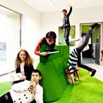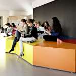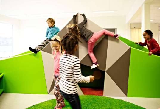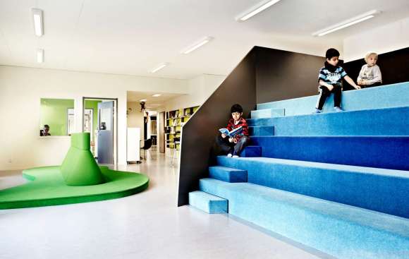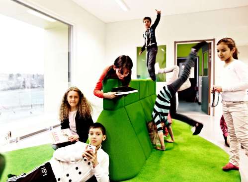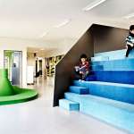 The students meet a customized library, a multi-colored stage and a particular common area for the youngest in the school’s kindergarten area. Here a green structure bends through space in various formations and opens a sprawling play and exploration landscape.