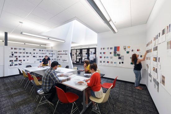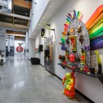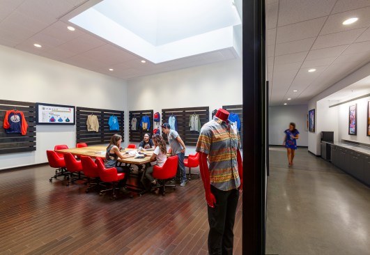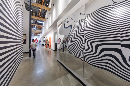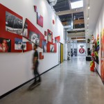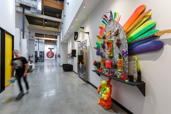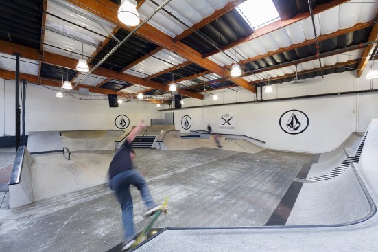 Volcom brand for inspiration, the space takes on a hand crafted, almost bohemian aesthetic incorporating simple, utilitarian materials, used in an extraordinary way. Raw wood, fiberglass, metal and fabric define and reinforce the Volcom image. A 3,500-square-foot indoor skate park has the ability to be converted into a presentation theater or exhibition space. A 4,000-square-foot company store, expansive showrooms and a sample warehouse work with the skate park to anchor the newly envisioned facility. The centerpiece of the design is an internal Volcom “street” feature allowing for simplified internal circulation and organization, with unique branding opportunities. The “street” incorporates art and images borrowed from the Volcom retail stores, staff artists and the products. Daylight is harvested through the incorporation of new skylights and the restoration of existing skylights throughout the space.