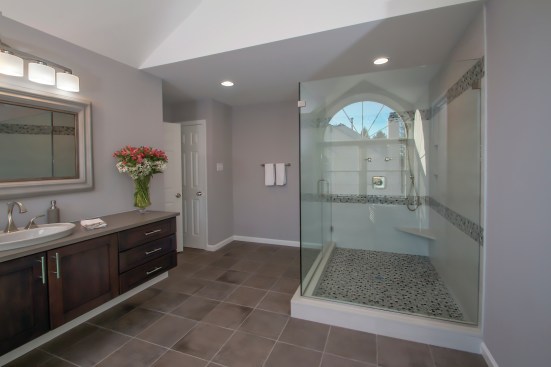 Under Construction Builders added a 1250 square foot two story addition to the rear of this home in Voorhees, NJ to allow for a larger kitchen, new laundry room and new office on the first floor. The second floor addition extended space to include a new alcove leading to two renovated bedroom suites, each with new full baths, as well as the addition of a walk-in closet over the existing garage and a newly renovated full bath in the master suite. The homeowners lived in this home for a few years until the husband's job relocated him to India for an extended period of time. When they decided to return to the US, they toyed with the idea of moving but loved their home and neighborhood. Rather than leave, they decided to keep the house and forged ahead with the substantial addition and numerous renovations. The majority of the renovation took place while the family was still living in India. It was somewhat challenging having the homeowners so far away and in a different time zone, but our team kept in constant contact via email, texting and BuilderTrend. This renovation exemplifies the requirements in this category because in addition to the added living space, no room went untouched, even if it was just new paint and flooring. Two major interior highlights of this project were replacing the existing interior staircase in the entryway with a new showstopping circular staircase and enlarging the kitchen to allow for two islands and a substantial eating area. The new staircase is complete with red oak treads, popular risers and stringers and Tuscan metal balusters. The entryway renovation was also highlighted with a new Classic Craft door with Borrassa wrought iron glass with side lights and a transom that coordinates well with the metal balusters of the staircase. The new kitchen addition was added to allow space for two large islands and an eating area along with adjacent enlarged den/family room area. The kitchen is flanked by a wall of windows to allow for lots of natural light and views of the backyard. It has a contemporary feel with ebony Wellborn Select cabinets, dark wood flooring, Alaskan White granite countertops and stainless steel appliances. Other interior renovations on the second floor included converting the two children's bedrooms into junior master suites, both with new full baths. The bedroom ceilings were modified from flat to cathedral ceilings. In addition, new carpet was installed in all of the bedrooms.The hall guest bath and master bath were also both renovated. A walk-in closet was added to the master suite as well as new dark wood flooring in the upstairs hall that coordinates with the circular staircase. The family room fireplace also received a face lift with a new floor to ceiling tile surround. Every room in the home was painted and new flooring was installed throughout. In addition, the home also received an exterior face lift with new Andersen 400 series windows throughout the entire house, new garage doors, re-stuccoed the exterior facade and installed a new 2 zone HVAC system.