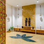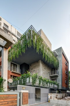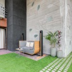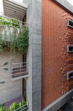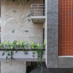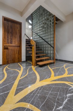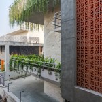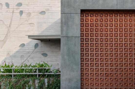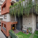 celebrate the spirit of the joint family of today’s time. The west facade of the building is a wall with a filtering function, It helps block most of the sunlight while allowing cool wind to enter the inner space. In the facade design, the terracotta screen is evenly perforated which greatly reduces heat gain in the spaces inside. The house establishes metaphorical relativity to a Tree- where the lift and staircase shafts perform as trunk with protruding boxes as branches of a tree. Taking the relativity further, the exposed RCC Staircase shaft is engraved and punctured with a huge tree diagram, allowing natural light to seep in the shaft. The material palette is an amalgamation of exposed brick, exposed concrete, grit plaster and terracotta in the exteriors with a flamboyant flavour with Jaisalmer (yellow) sandstone and grey Italian stone flooring used in