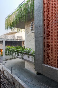 specific spaces in the interiors. Within this mixed palette, we managed to adhere to the contrasting choices of both families managing uniformity amidst diversity of all internal spaces. The timber planked internal staircase with a tall backdrop of voluminous exposed RCC wall is punctured with leaf shaped openings. Each bedroom is benefited with an access to terrace garden or a balcony overlooking the terrace garden, thus enhancing the experience of the space and the experience of freshness in the rooms. The terrace garden becomes an important sustainable feature to cut out the heat passing through and promote the experience of green living in the urban scenario. The primary concern of providing private spaces for all the members, without compromising the feel of an independent bungalow, as opposed to an apartment typology was challenging. Individual spaces across three levels enabled us to maintain privacy for the family members.