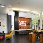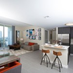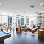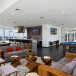 The building’s interior has a modern yet warm ambiance with light colors of orange and red to contrast gray, white and black tones. The ground floor and lobby have a transparent façade with 20-foot floor to ceiling glass that enhances the interaction with the Riverwalk, the New River and neighboring park.