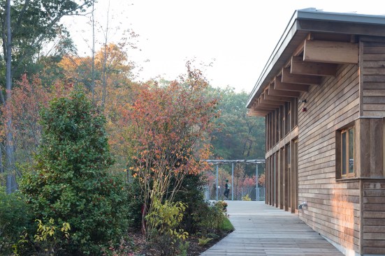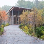 The new Visitor Center interweaves with the landscape to emphasize Walden Pond and the site. Maryann Thompson Architects held the building off the central axis from the pond to the parking lot so that the Center takes a secondary position to the view of the pond. A meandering and accessible ramp draws the public up and onto the trellised deck, which leads to the exhibition space and public facilities. Nestled within existing trees and new plantings, the project gives a sense of unfolding sequence and exploration. Exhibition spaces dedicated to the impact of Walden on the world, as well as a community meeting room, and staff offices, create a new hub.