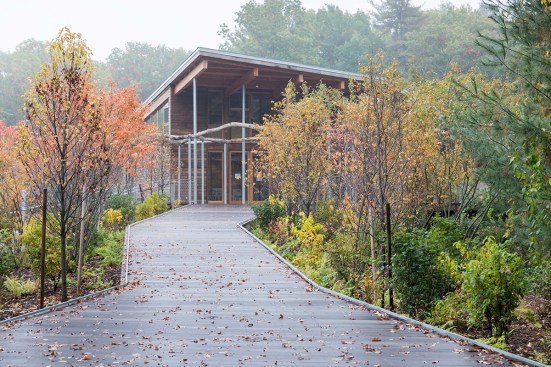 Local context and site conditions informed the design strategy and implementation at all levels. The deck with black locust trellis members is clad with locally-sourced, heat-treated ash. Heat-treating wood is excellent for outdoor applications, and prevents the use of scarce rainforest woods such as Ipe. The project also used a portion of the former visitor center foundation, as part of an ethos of salvaging and saving. The office millwork was done in Massachusetts Red Oak harvested by DCR’s forestry team specifically for the Visitor Center.