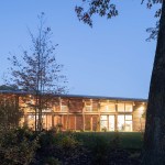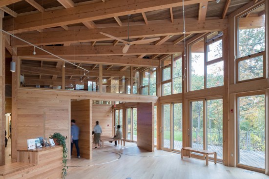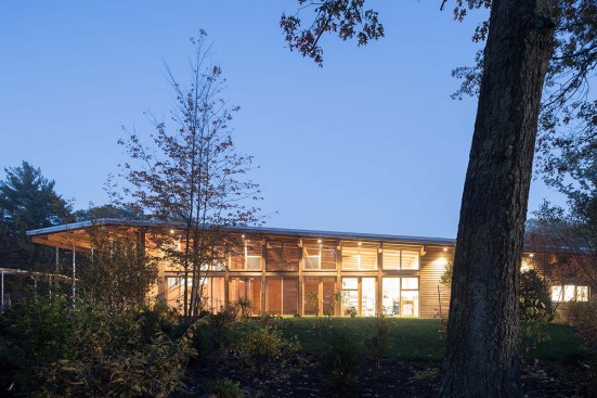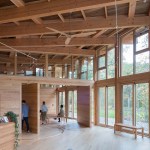 The building is net-zero energy, with no reliance on fossil fuels for its operation. A PV solar array doubles as a shade structure over the parking lot and supplies all of the project energy needs. In winter, triple-pane windows and super insulation keeps the spaces at a comfortable temperature with little reliance on the energy-efficient electric heat pump system. In warmer months, the ample operable windows and ceiling fans create natural ventilation. Projecting timber overhangs work to reduce solar heat gain. As the structure and building components are visible and legible, visitors to the Center also have an interactive sense of the ecological building principles, which are contemporary expressions of the legacy of Henry David Thoreau and the American Conservation Movement.