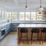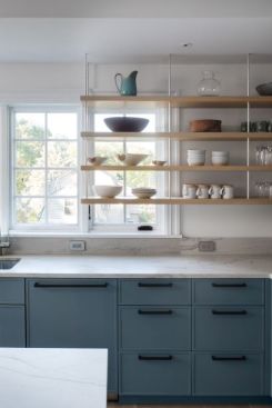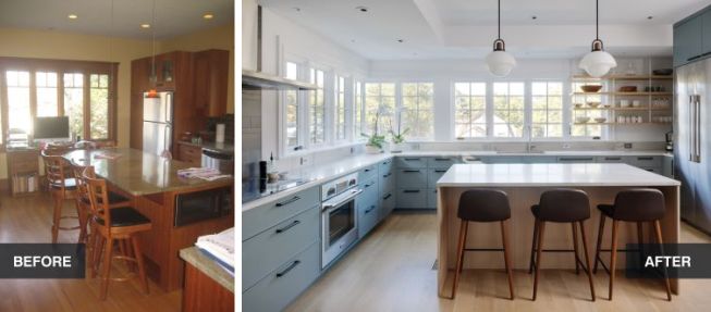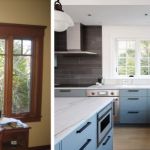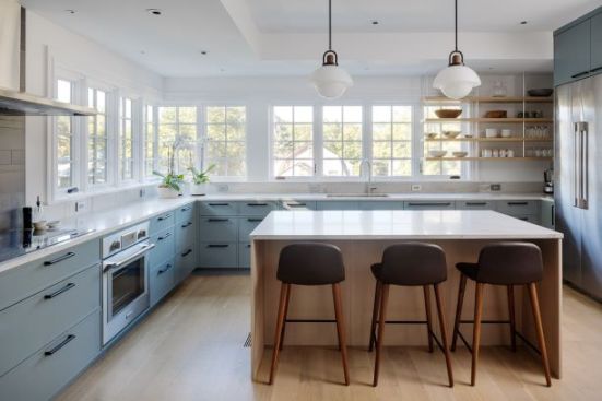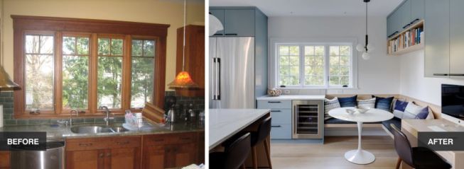 Inside, on the main level, the details, colors, and furniture were unified to make the spaces feel connected and consequential. A dark and disconnected original kitchen was transformed into a bright, functional hub of activity in a now sunlit filled space. Intricate original trim details juxtapose with clean, modern cabinetry in soft blues and crisp, linear white oak. A thoughtful breakfast nook and a spacious island provide areas for an active family to gather throughout the day. Unused corners are now functional spaces for office work, entertaining, and plentiful storage. A simple corridor becomes a drop zone for coats, shoes, supplies, and a small powder room, all hidden behind a series of seamless doors made to look like an extension of the surrounding walls. Targeted updating on the rest of the main level included floor finishes, additional insulation, architectural details, furniture design and lighting.