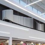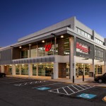 The design of the 13,300 SF marquee store included the elimination of the 2nd floor, which allowed for enhanced ceiling height and clerestory windows on all sides of the extension. Additionally, 8 feet by 1 foot slot windows allowed for light to radiate out at night, linear design motifs provided views of the atrium. In keeping in compliance with the city of Rockville lighting limitations, site lighting was incorporated on the building and in the design. As well as fulfilling the City of Rockville’s art in Public Places requirement, a prominent 37 foot long niche hovering over the main store area featured local artist Greg Braun’s sculptural installation of a sequence of flowing drywall panels.
