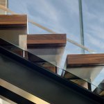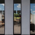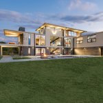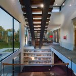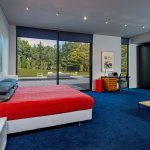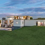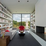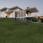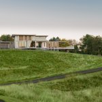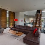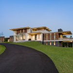 The overall design is a modernist play of thin horizontals and sturdy verticals, alternated with glass, perfectly balanced over the sloping terrain. The effect is at once eye-catchingly bold, and harmonious with the surrounding landscape.