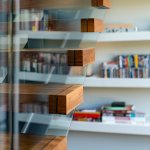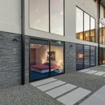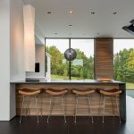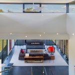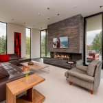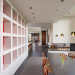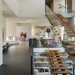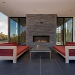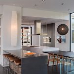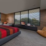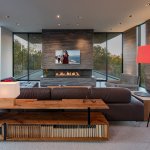 The changing seasons were also a consideration in the design. Unlike when building for his signature West Coast lifestyle, here steps were taken to provide for the harsh climate – hot and humid in summer, lots of rain and snow in winter. Dual-pane high efficiency glass by Western Window Systems was used throughout, and a geo-thermal heating and cooling system was installed. Due to the cold, frost line foundations were deeper, and all structural systems were strengthened to accommodate a snow load on the roof. The exterior materials are white plaster and horizontal stacked stone, and what looks like wood on the exterior is actually porcelain tile, chosen for its warm look and practicality, as it will better withstand the harsh weather. Glass screens surround the second floor terrace in place of guardrails, adding a floating quality to the design. This is an unusual construction element in the East, as special consideration must be made for contraction in cold weather.