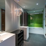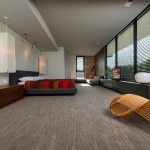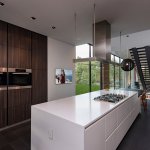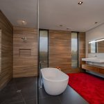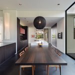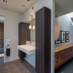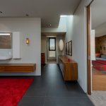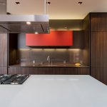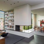 The interiors and surfaces embrace crisp edges and natural tones, complementing the house’s modernist lines, and large format (48×48) dark grey concrete-finish porcelain tile is seen throughout the main living area and terrace. The kitchen and breakfast bar area feature Poliform cabinets of lacquer and wood veneer, white Caesarstone countertops, and appliances by Miele. Between the dining room and the library/lounge there is a sleek peninsula holding a fireplace by Ecosmart, fueled by ethanol. The master suite occupies the top floor, quieted with neutral carpeting and warmed with accent walls in walnut. The downstairs dark porcelain tile is repeated in the double master bath and dressing area, where the porcelain fixtures are from Badeloft, and Blu Bathworks provided the faucet fixtures.
