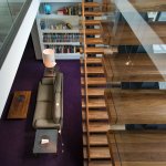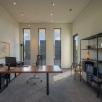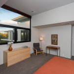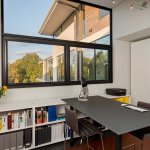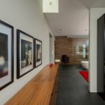 The 6,700 sq. ft., 4 bedroom, 4½ bath house is organized around a central volume filled by the solid walnut staircase, which goes from the main floor up to the master suite, and down to the two teenagers’ bedrooms on the lower level. Due to the sloping grade the house is entered from the street side onto the main level, but exited on the lower level at the back of the house, onto the patio and pool area – what is called a “walk-out” basement. There is also a guest bedroom on the main level at the back of the house, and a home office tucked away in a quiet spot next to the garage.